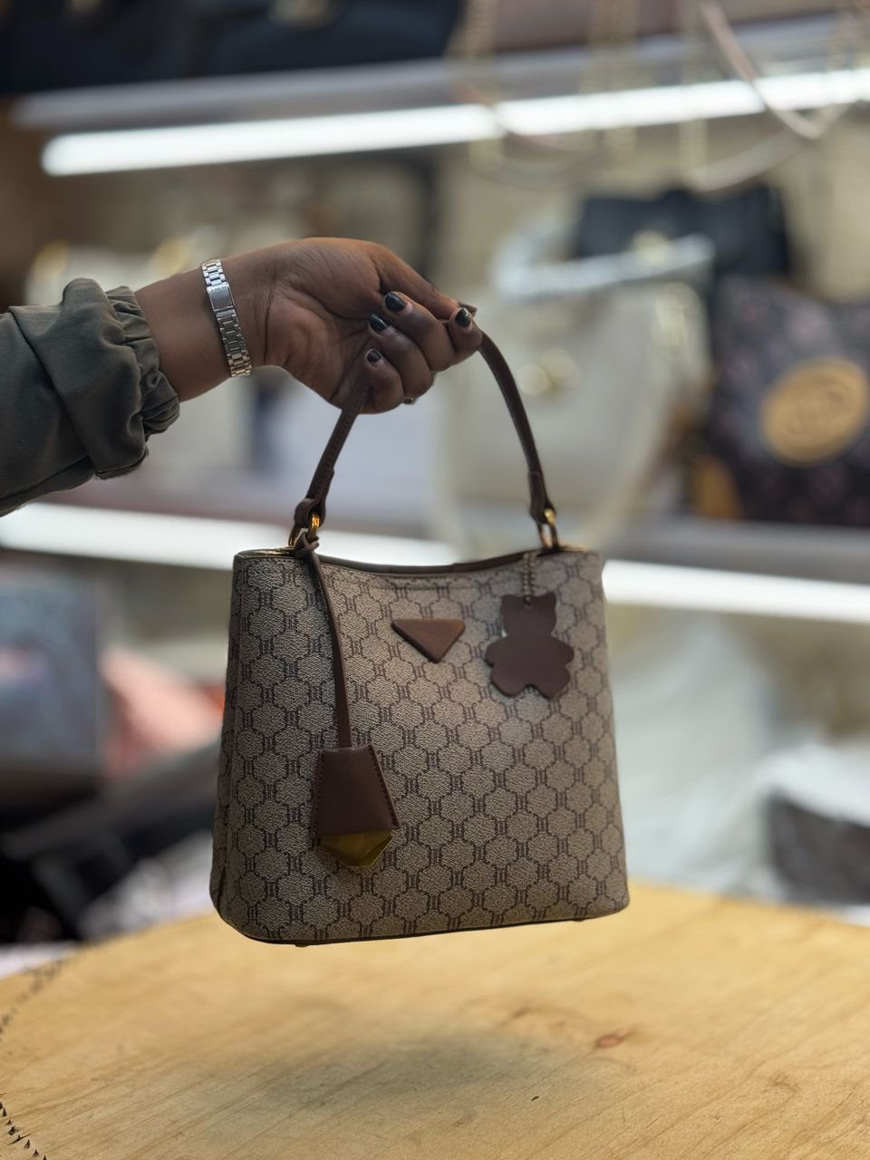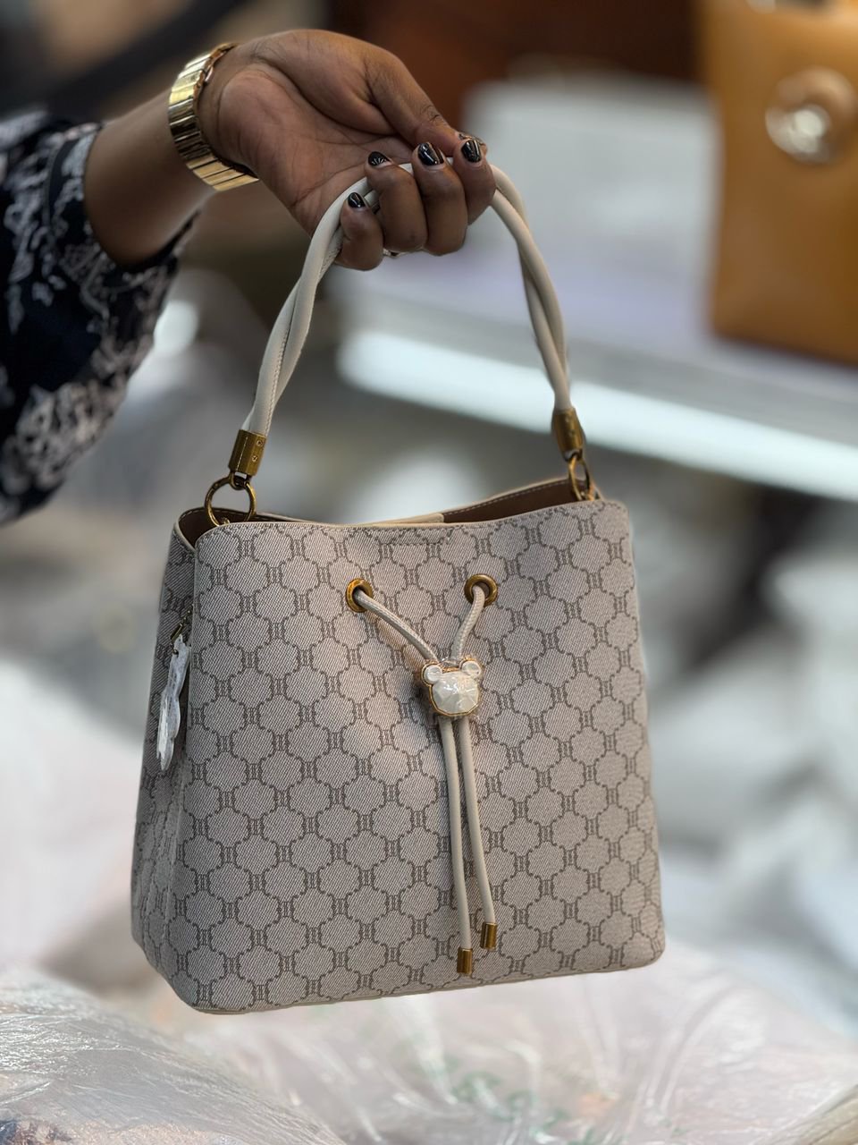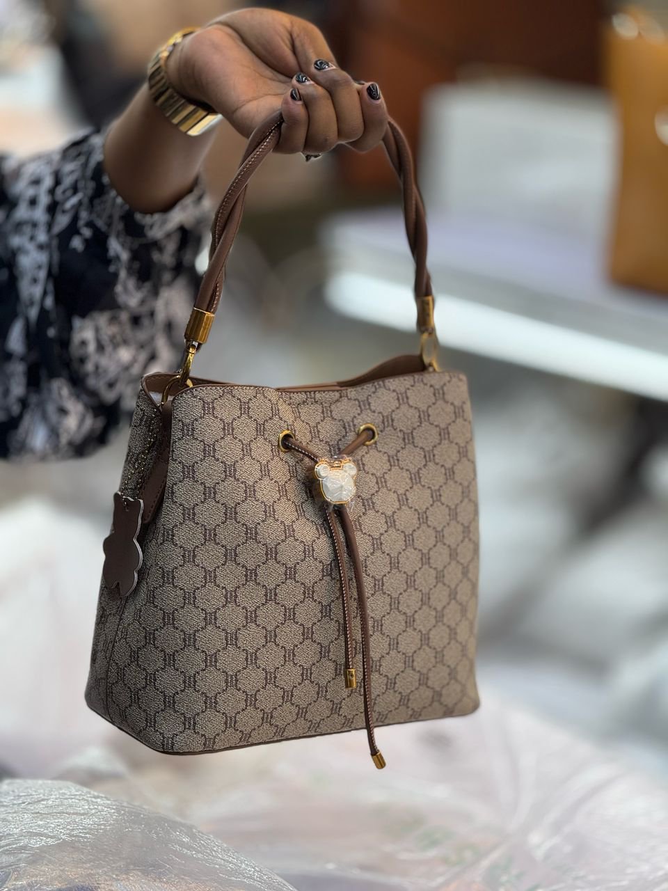 It has a drawstring closure at the top, adorned with a decorative element, possibly a bear-shaped charm. The handles are braided or twisted and appear to be made of a lighter material, contrasting slightly with the body of the bag. Gold-toned hardware is visible at the handle attachments and the ends of the drawstring.